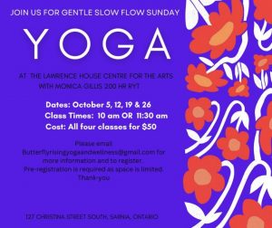 Slow Flow Yoga sessions with Monica Gillis will resume begin a new session on October 5th. Registration is required as space is limited. Please email butterflyrisingyogaandwellness@gmail.com