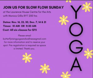 Slow Flow Yoga sessions with Monica Gillis will begin a new session on November 16th. Monica is offering a class at 10:00 AM or 11:30 AM .Registration is required as space is limited. Please email butterflyrisingyogaandwellness@gmail.com