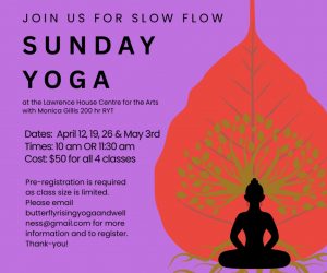 Slow Flow Yoga sessions with Monica Gillis will begin a new session on April 12. Monica is offering a class at 10:00 AM or 11:30 AM. Registration is required as space is limited. Please email butterflyrisingyogaandwellness@gmail.com
