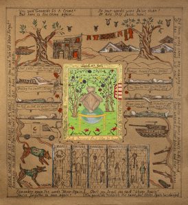 Child through war What do you see? Pomegranates, figs, and an olive tree Child through war What do you see? Smoke, steel, and concrete on me Child through war What do you see? Family and friends weeping, crying for me Child through war What do you see? Dark clouds looming, above brown trees Child through