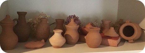 These simple, rustic pieces of pottery have made the remarkable journey from Gaza to the UK and now to Sarnia, Canada! I am a Palestinian from Gaza and my wife is English, and we lived in Gaza from 1984 to 2000, after which we immigrated to Canada. My mother and father-in-law came regularly to visit us and our children in Gaza, and enjoyed visiting cultural sites and craft workshops. I took them often to a pottery shop in an area of Gaza called Al-Fawakhir. There, over a period of years, they bought many small pieces of pottery, oil lamps, water or wine vessels, jars and pots. These small ceramics (varying in size from one to seven inches) are miniature examples of larger pieces, and were made primarily as souvenirs for the burgeoning tourist trade at that time.